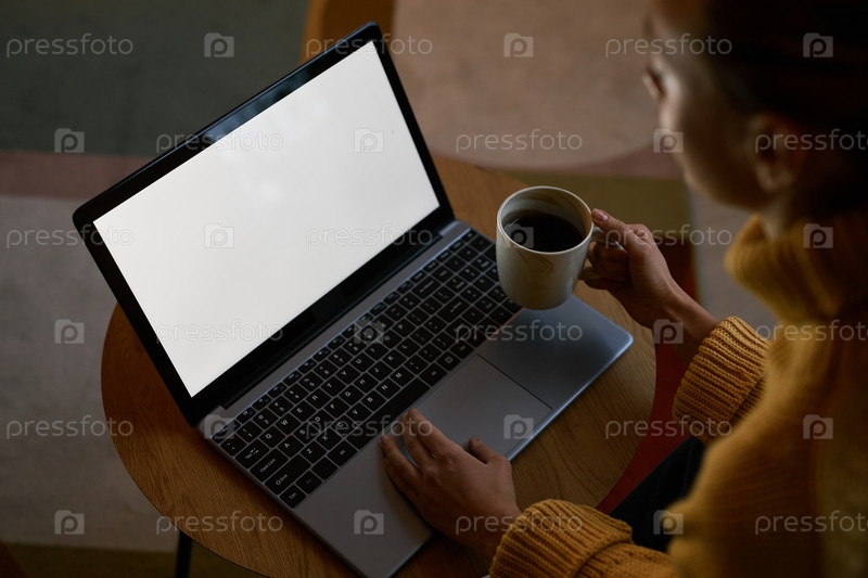 Посмотреть на молодую женщину, использующую ноутбук с пустым макетом экрана