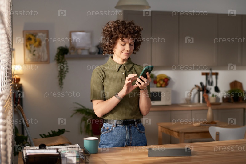 Женщина печатает сообщение на смартфоне, стоя в кухне