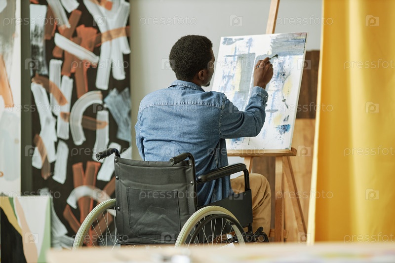Задний вид афроамериканского художника-мужчины в инвалидном кресле, рисующий на холсте