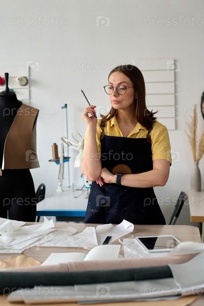 Вдумчивая женская швея в фартуке стоит перед рабочим местом