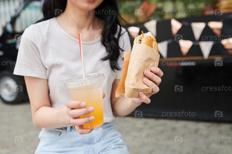 Обрезанный снимок молодой женщины в футболке, держащей хот-дог и апельсиновый сок