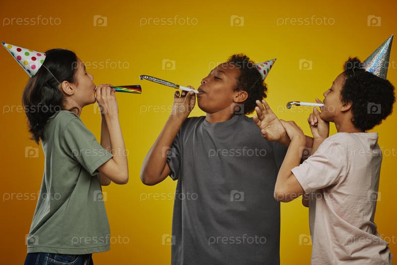 Группа из трех межкультурных детей до подросткового возраста, дующих в свистки