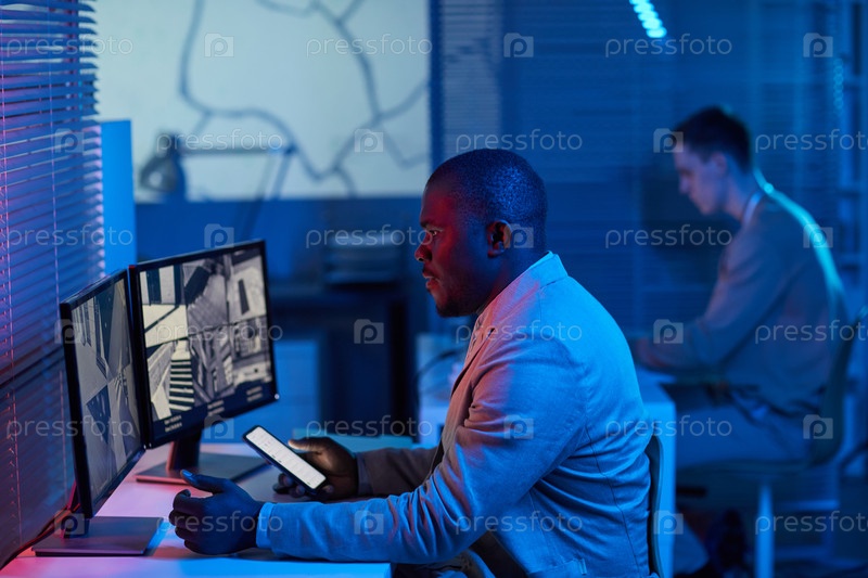 Чернокожий мужчина смотрит на записи камер видеонаблюдения в офисе центра безопасности