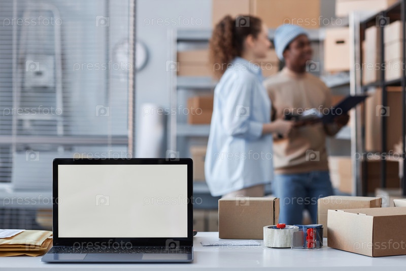 Ноутбук с белым пустым экраном стоит на рабочем месте менеджера