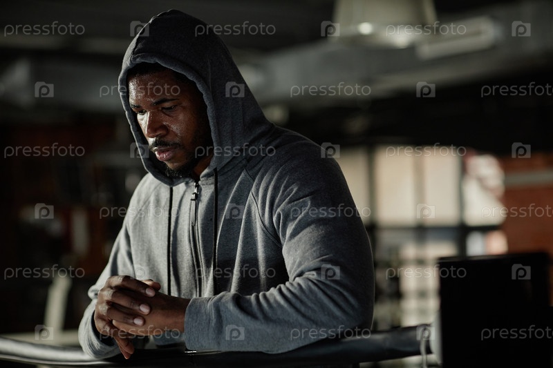 Молодой афроамериканский спортсмен в серой толстовке стоял в боксерском клубе