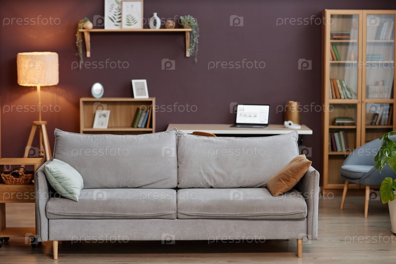 Минимальный интерьер дома с удобным серым диваном в гостиной
