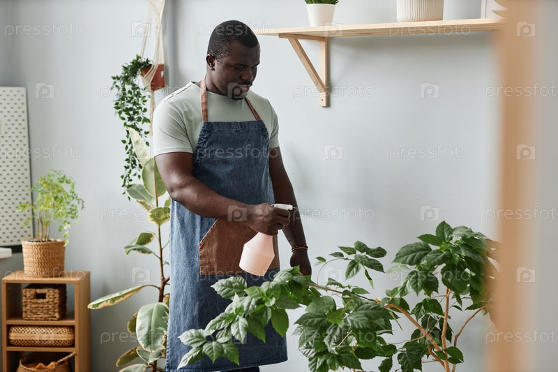 Взрослый чернокожий мужчина держит поливную банку и ухаживает за зелеными растениями в помещении