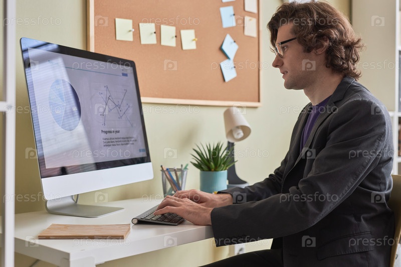 Улыбающийся мужчина с длинными волосами, использующий компьютер за столом в офисе или на домашнем рабочем месте