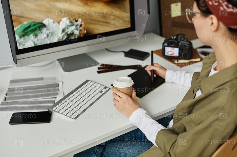 Женщина-фотограф ретуширует фотографии
