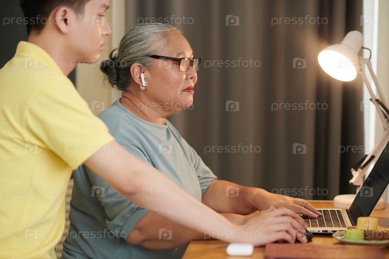 Женщина-старший учится работать на компьютере