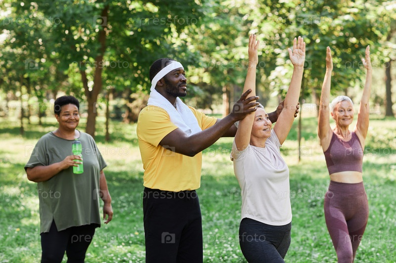 Улыбающийся спортивный тренер помогает группе старших женщин, наслаждающихся тренировками на свежем воздухе