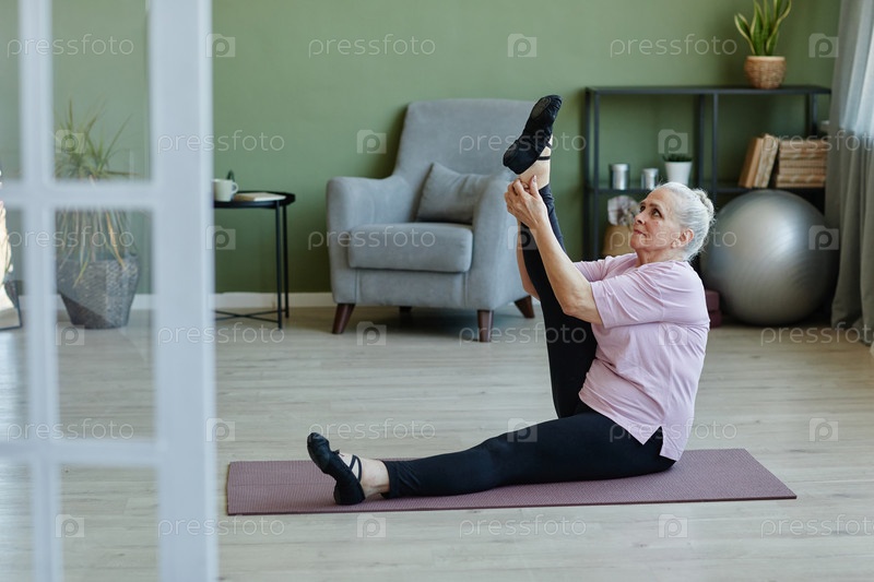 Пожилая женщина в активной одежде делает физические упражнения на коврике йоги в гостиной