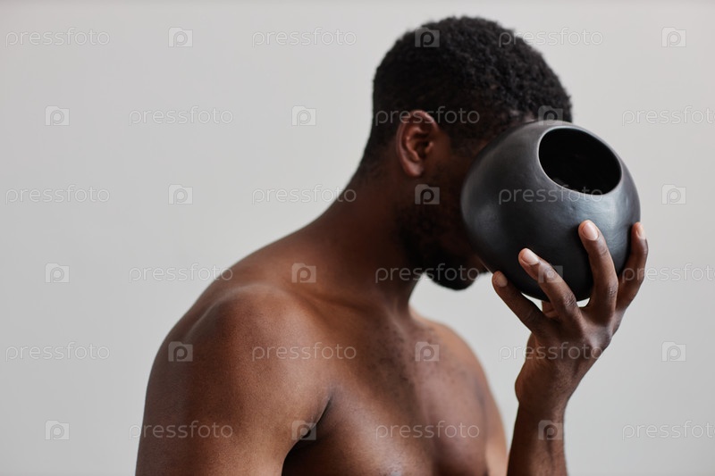 Минимальный концептуальный снимок без рубашки чернокожего мужчины, держащего круглую танную вазу
