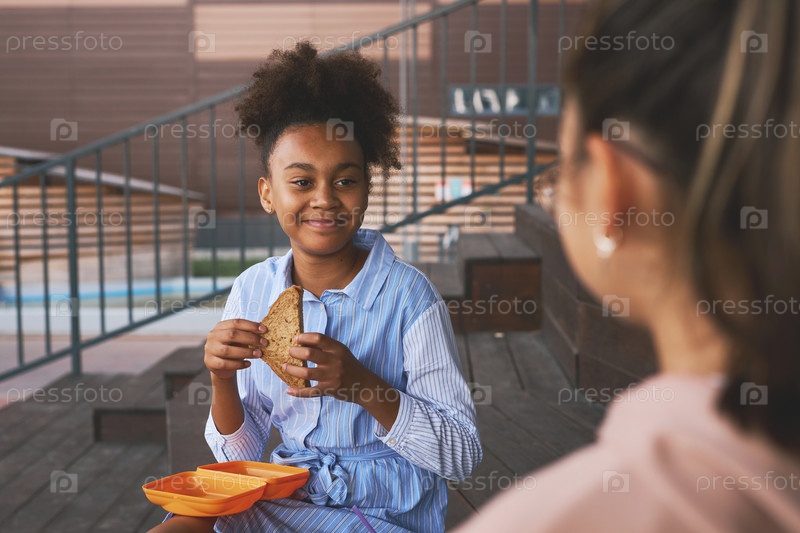 Улыбающаяся афроамериканская девушка с бутербродом смотрит на свою подругу