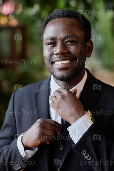 Улыбающийся чернокожий мужчина готовится к свадебной церемонии