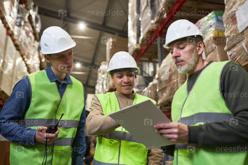 Группа из трех рабочих на складе, удерживающем клипборд