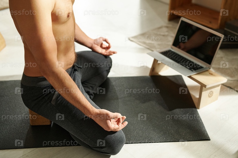 Мужчина занимается йогой онлайн с помощью ноутбука