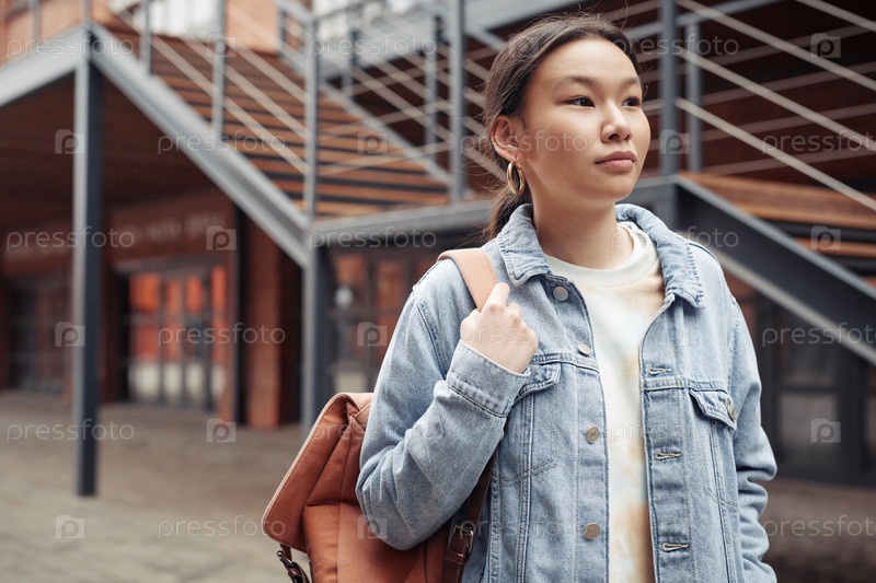 Спокойная девочка-подросток в повседневной одежде держит рюкзак за плечами во время прогулки