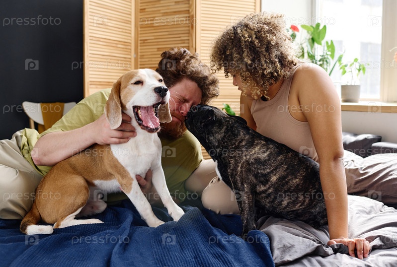 Мужчина и женщина с домашней собакой в спальне