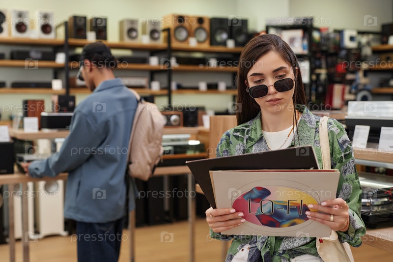 Молодая женщина держит набор виниловых пластинок в музыкальном магазине