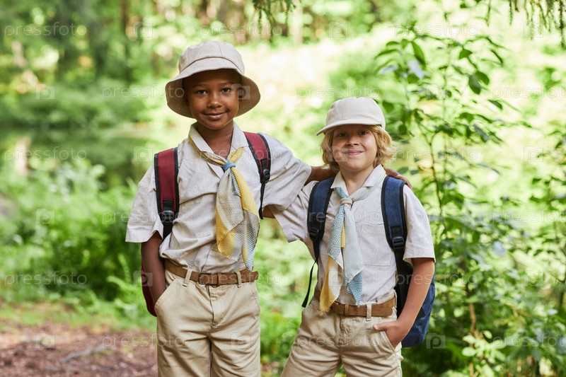 Два милых бойскаута смотрят на камеру в лесу, наслаждаясь экскурсией