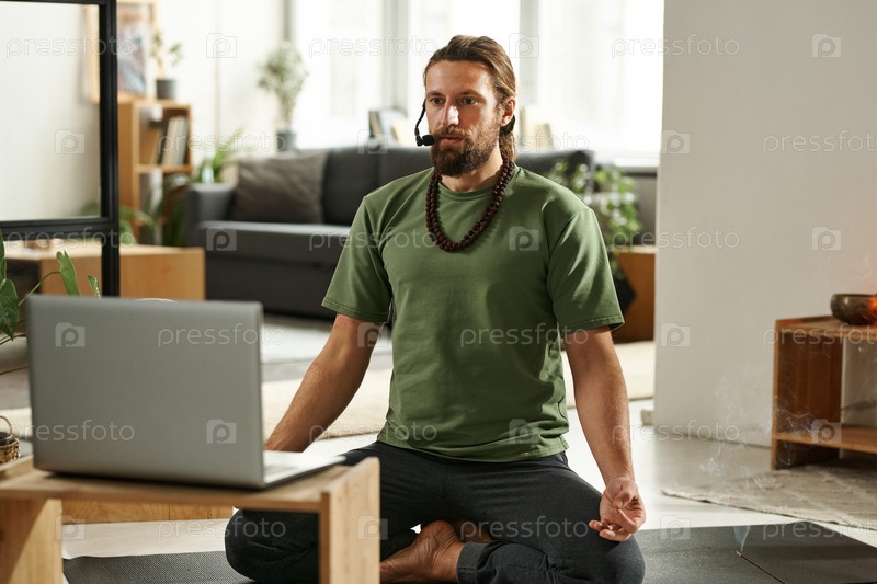 Инструктор по йоге преподает йогу онлайн на ноутбуке