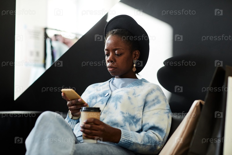 Элегантная чернокожая женщина в шляпе, отдыхающая в салоне торгового центра