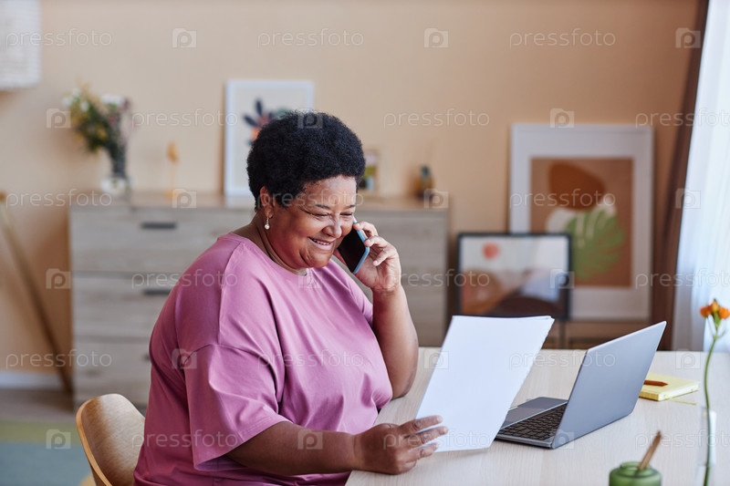 Счастливая зрелая женщина в розовой футболке смотрит на документ и звонит