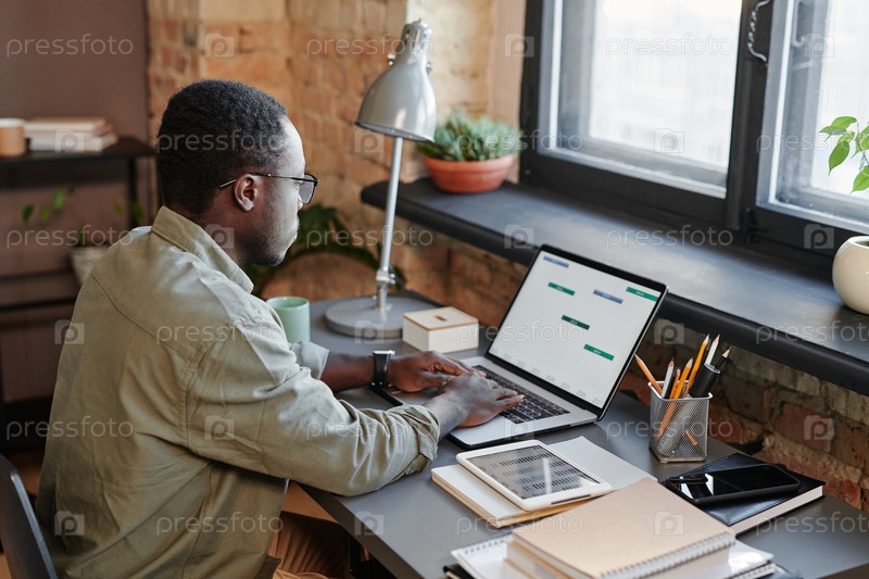 Черный мужчина работает на ноутбуке
