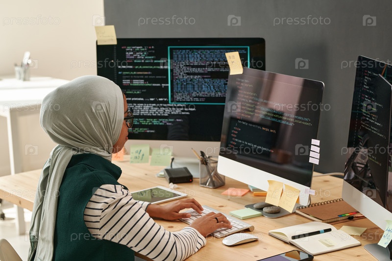 Молодая женщина в хиджабе печатает на клавиатуре компьютера, декодируя данные