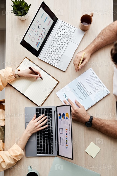 Выше вид рук двух молодых студентов, сидящих перед ноутбуками