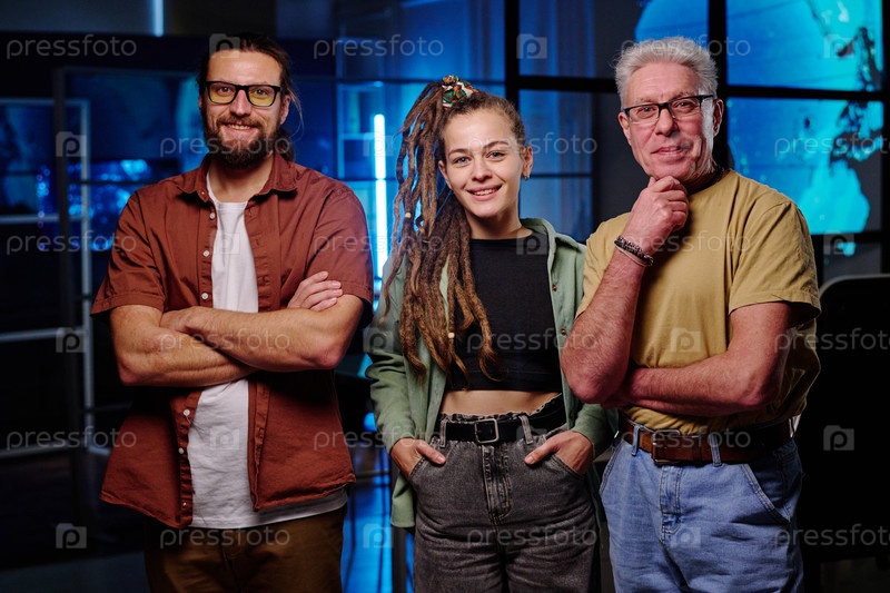 Группа из трех счастливых ИТ-инженеров в повседневной одежде, смотрящих на камеру