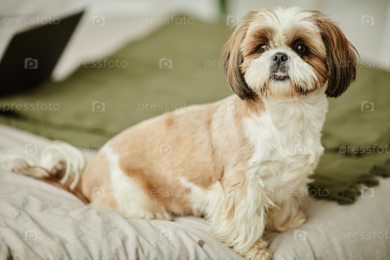 Милая собака ших-цу сидит на кровати и смотрит на камеру в уютном доме