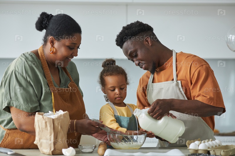 Семья делает тесто для выпечки кондитерских изделий