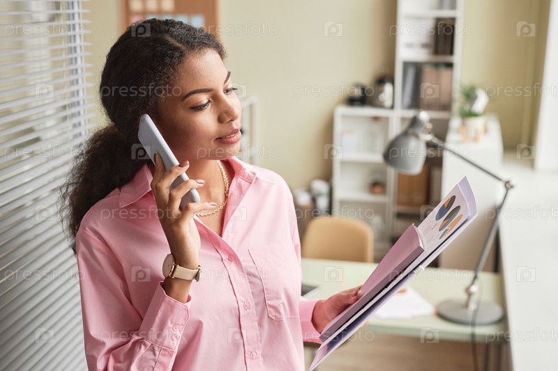 Черная бизнесвумен звонит по телефону в офисе и держит документы