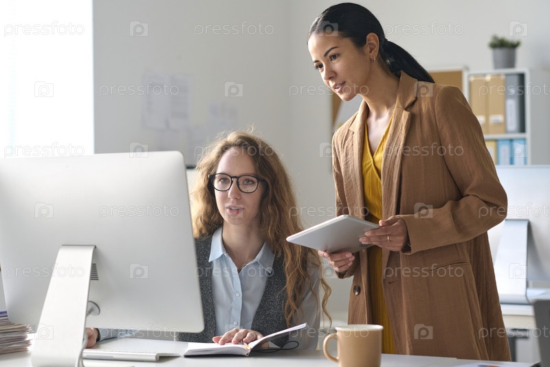 Коллеги обсуждают онлайн-презентацию на компьютере