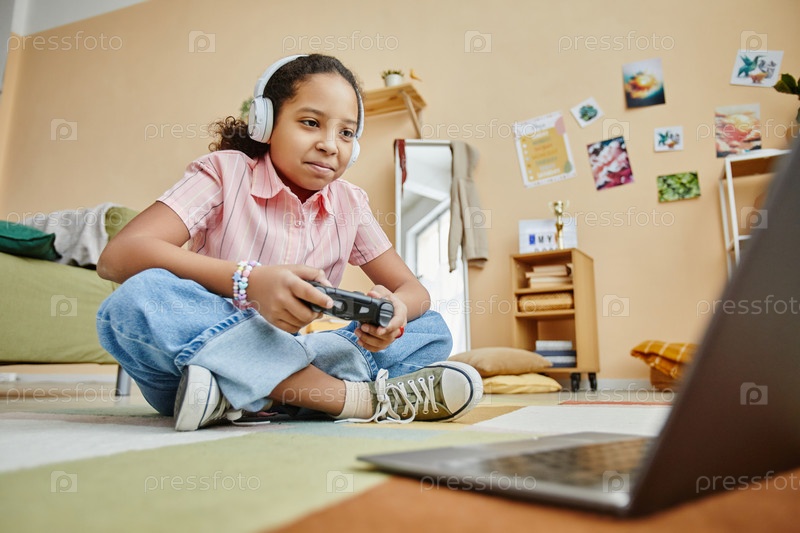 Счастливая школьница с джойстиком, нажимающая кнопки и смотрящая на экран ноутбука