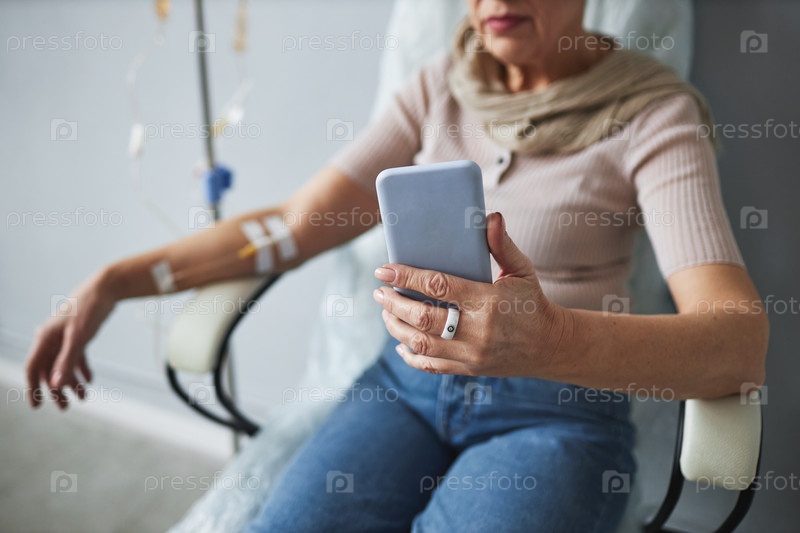 Ближайшее изображение пожилой женщины, использующей смартфон во время лечения