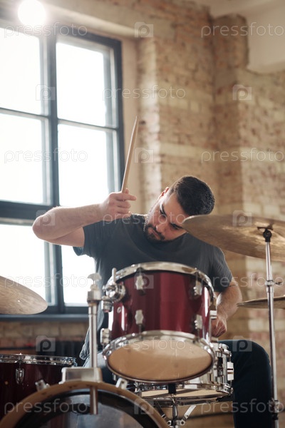 Барабанщик играет на барабанах, сидящий у ударного набора