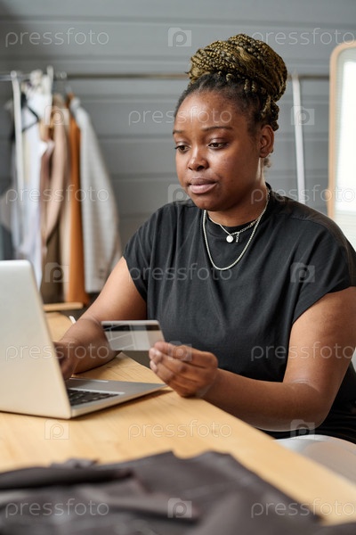 Молодая современная женщина-потребительница платит кредитной картой за товары онлайн