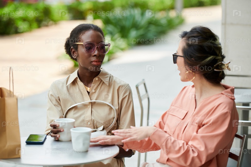 Элегантная женщина в солнцезащитных очках обсуждает новости, отдыхая в открытом кафе после покупок