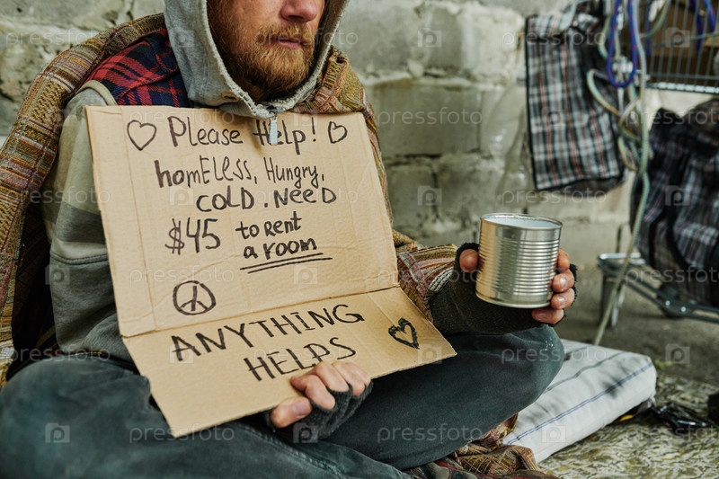 Бедный человек с плакатом, просящим на улице