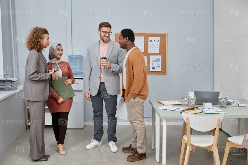 Группа молодых офисных менеджеров, которые смотрят на своего афроамериканского коллегу
