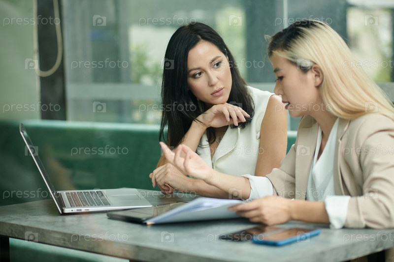 Деловая женщина смотрит на говорящего коллегу