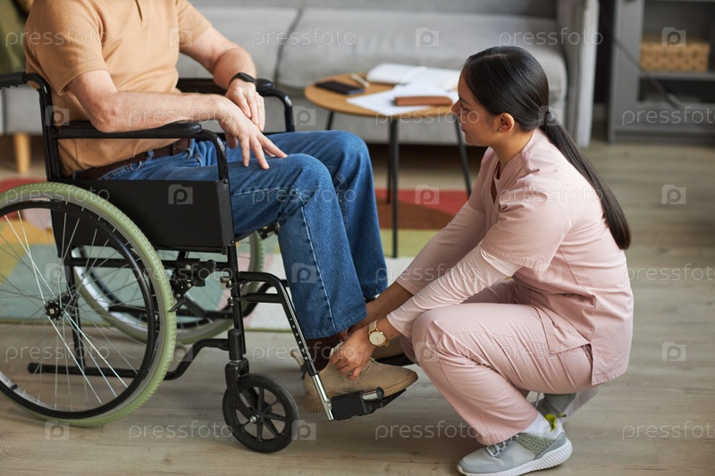 Социальный работник связывает шнурки с мужчиной-инвалидом
