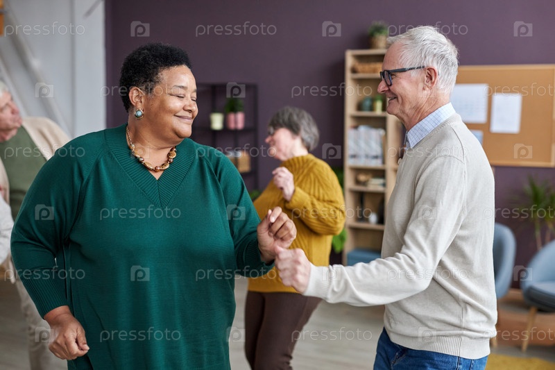 Поднимите талию пожилые пары, танцующие в доме престарелых и наслаждающиеся групповыми мероприятиями