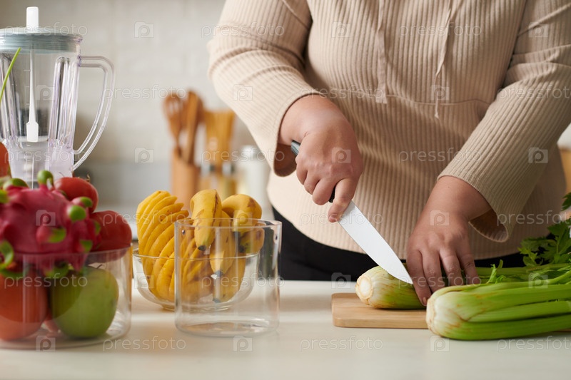 Женщина, режущая сельдерей для смоти