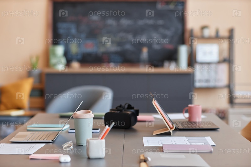 Фонное изображение офисного рабочего пространства с VR-гарнитурой на заседательном столе