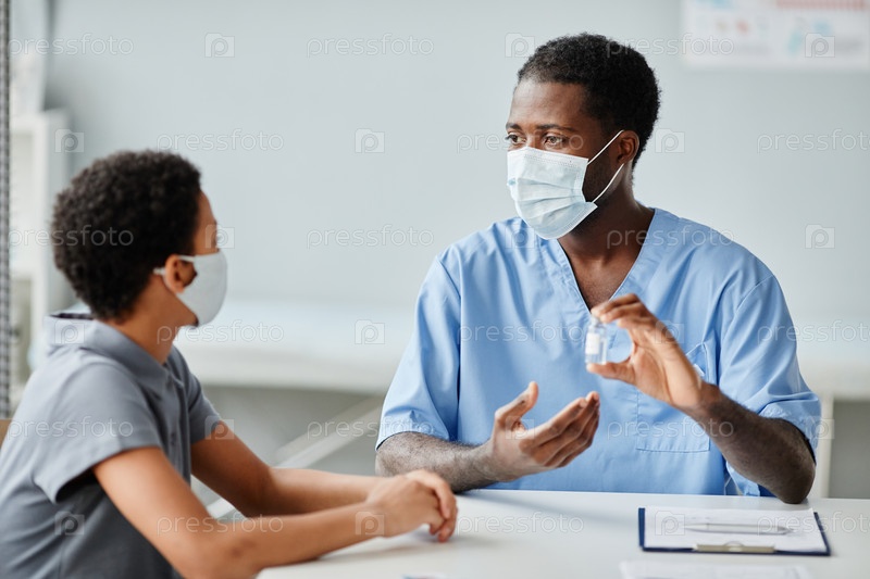 Врач показывает флакон вакцины ребенку в клинике вакцинации