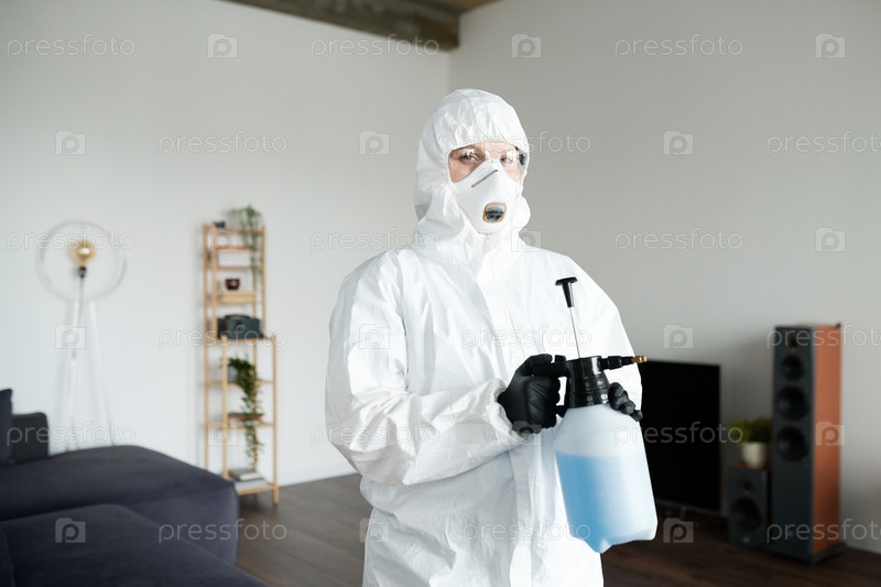 Уборщица в защитном костюме дезинфицирует квартиру